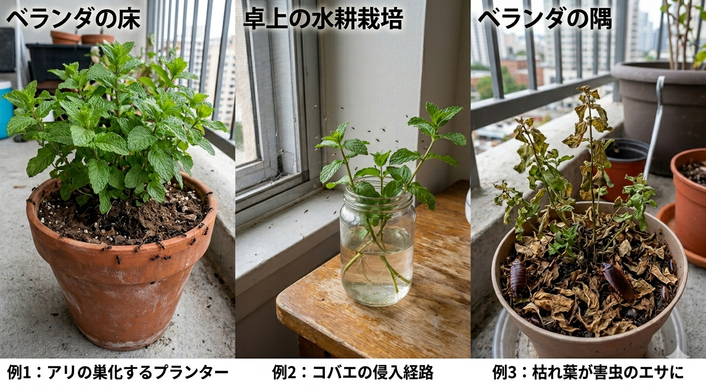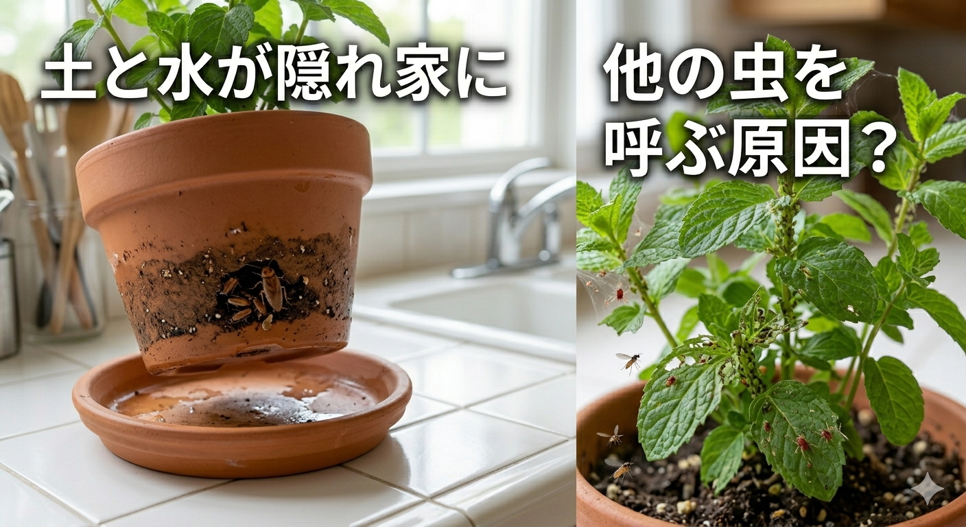 - 植物を育てるための「湿った土」や「水」が虫の隠れ家になってしまう