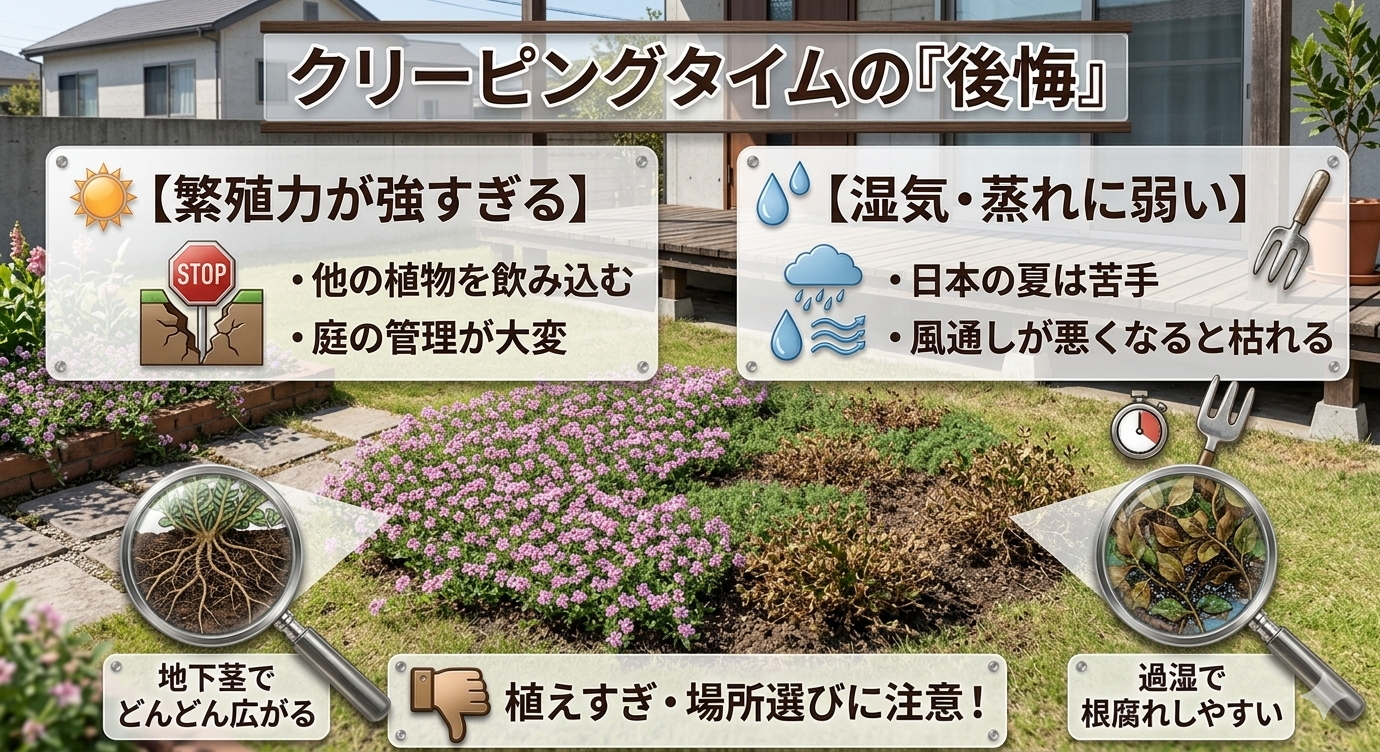 クリーピングタイムは、地面を這うように広がる性質を持っています。この旺盛な生命力こそが魅力でもあるのですが、時としてデメリットになってしまうこともあるんですね。