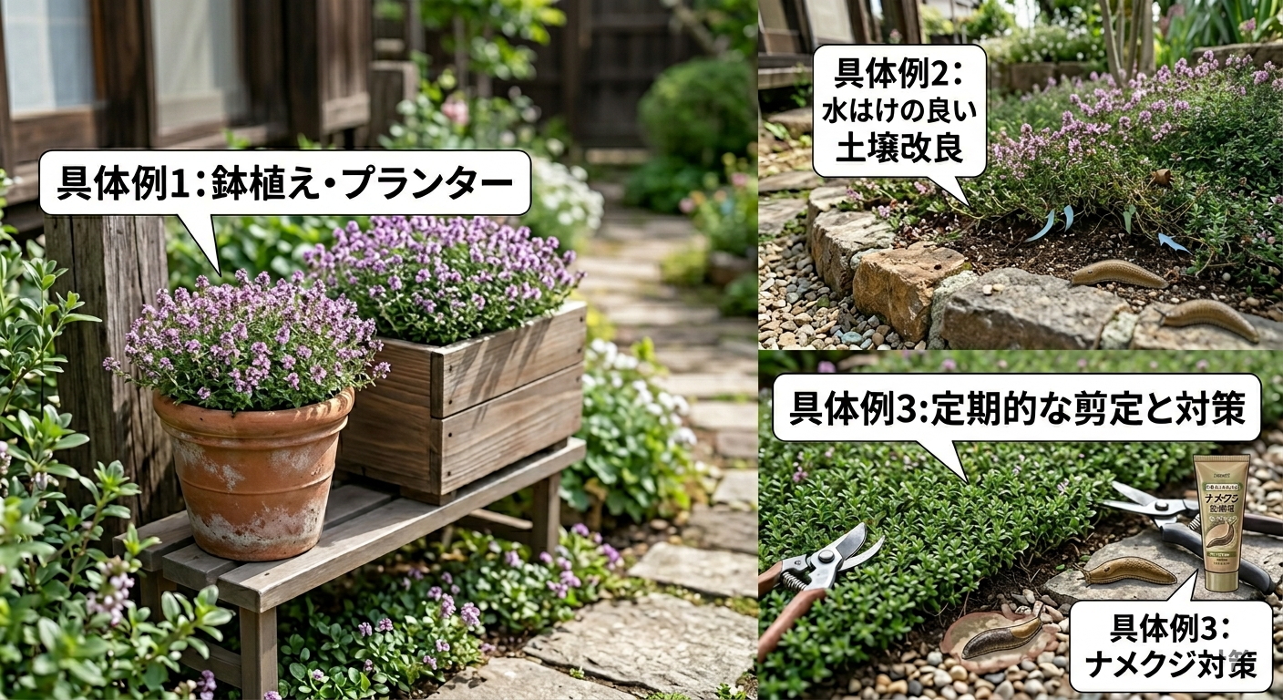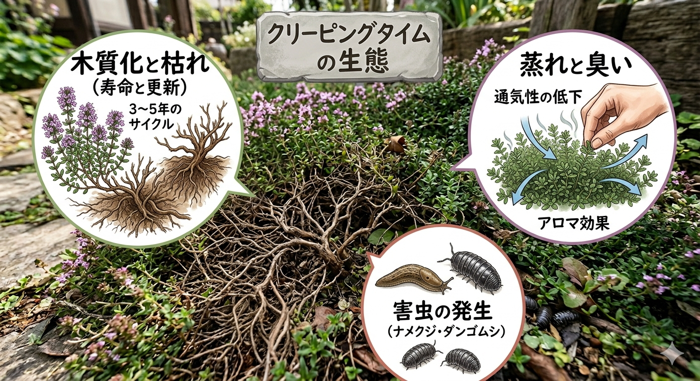 確かにハーブ特有の香りはありますが、虫を完全に遠ざけるほどの強い効果はないと言われています。それどころか、地面をびっしりと覆うように育つため、株元に日光が届かず、湿度が常に高い状態になってしまうんですね。