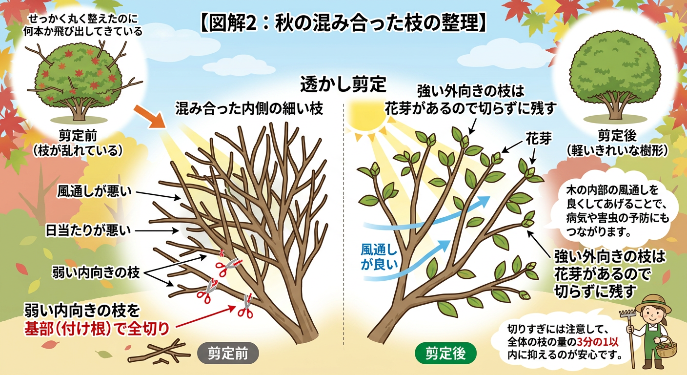 秋の時期は、翌年の花芽がすでに枝の先端にできているため、全体をバッサリ切るのは絶対に避けてくださいね。この時期は、木の内部で混み合っている不要な枝を根元から切り落とす「透かし剪定」がメインになります。