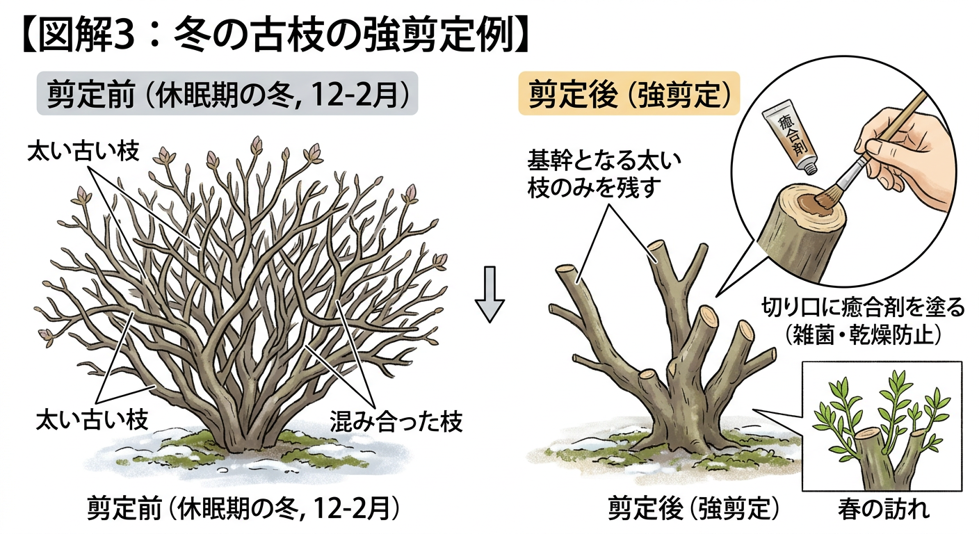 具体例3:冬(12〜2月)の休眠期に行う強剪定と古枝切り