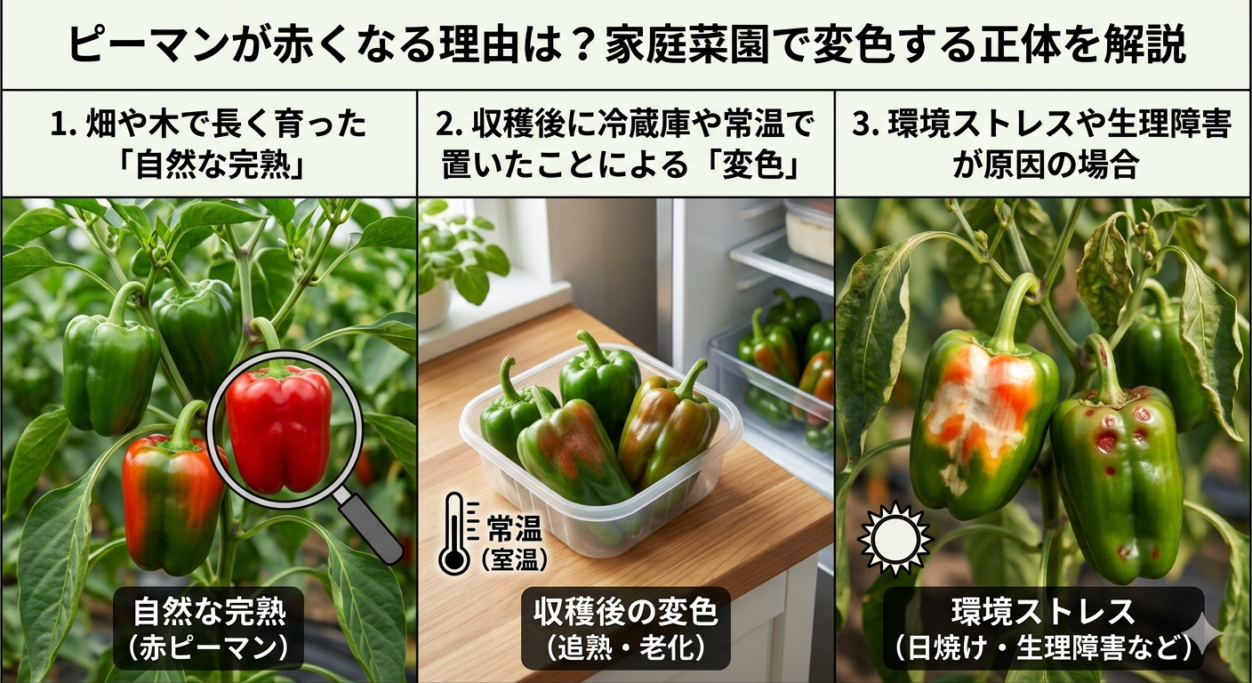 緑色のピーマンが真っ赤に変わるなんて、まるで手品のようで不思議ですよね。でも、これには植物ならではのしっかりとした理由があるんです。大きく分けて3つのパターンがあるので、一緒に見ていきましょう。