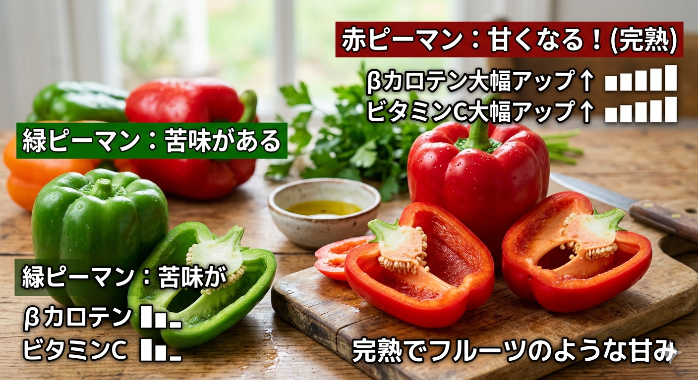 ただ、ここで気をつけたいのが、これは「追熟(ついじゅく)」ではないということです。ナナやメロンなどは、収穫後に置いておくと甘くなりますよね?でもピーマンの場合は、木から切り離された時点で養分の供給がストップしているため、赤くなっても甘さや栄養は増えません。単に「色が変わっただけ」の状態なんですね。