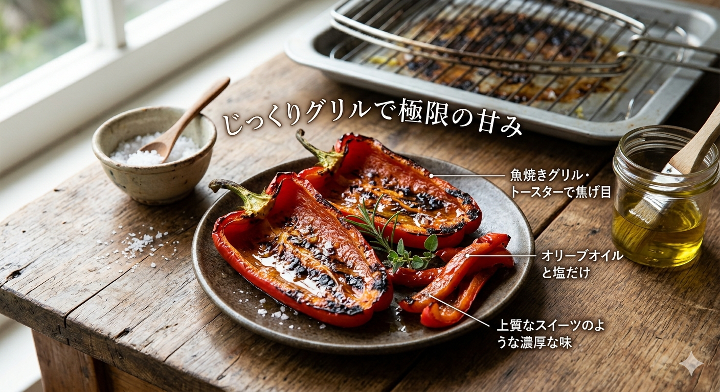 赤ピーマンを縦半分に切り、種を取り除きます。オリーブオイルを軽くまわしかけ、魚焼きグリルやトースターで表面に少し焦げ目がつくまでじっくりと焼きます。熱々のうちに、お塩をパラッと振るだけ!熱を加えることで甘みがさらに引き立ち、まるで上質なスイーツのような濃厚な味わいを楽しめますよ。お肉料理の付け合わせにもぴったりです。