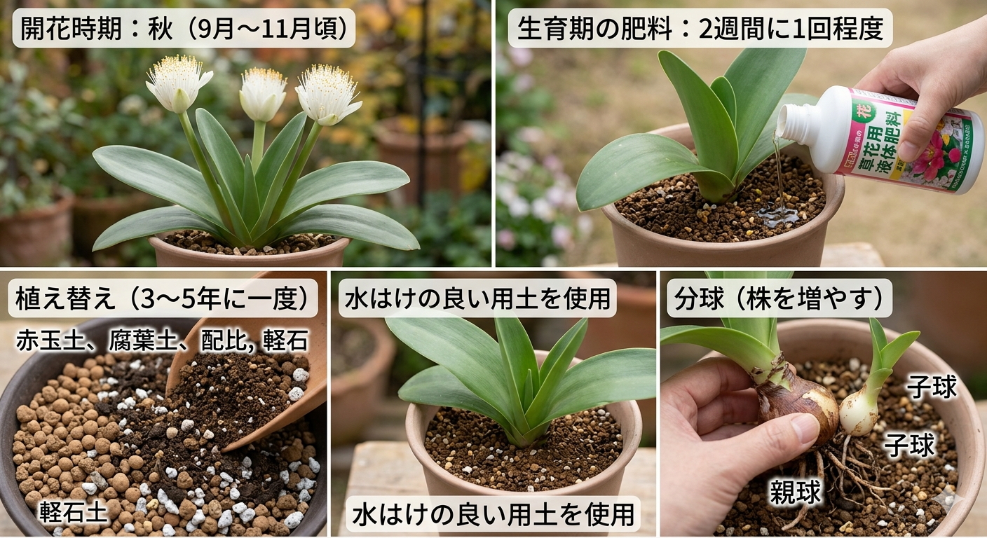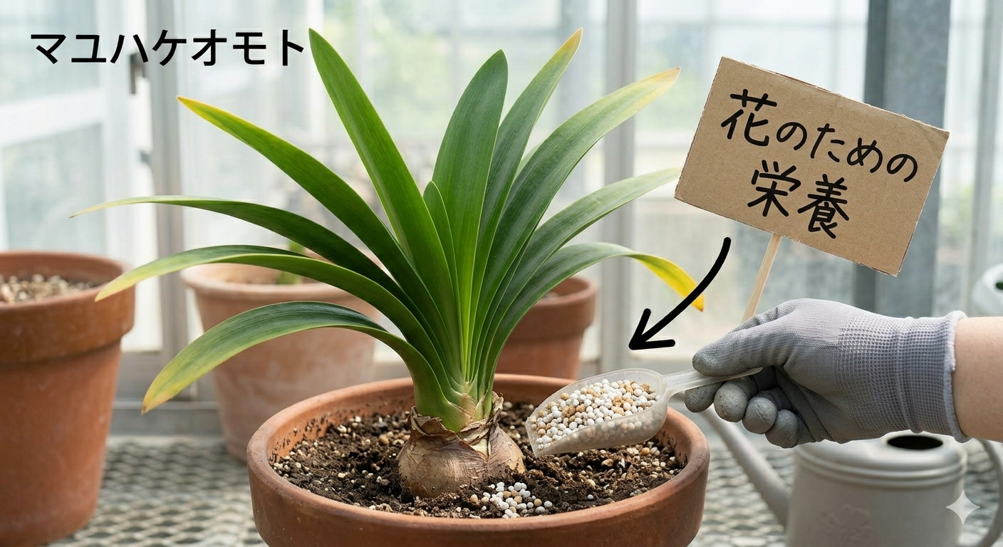 適切な時期に、適度な量の肥料をあげることで、球根がしっかりと強化されて、次のお花を咲かせる準備を整えることができます。家庭菜園で美味しいトマトを育てるために肥料をあげるのと同じように、マユハケオモトにもお花を咲かせるための体力作りが必要なんですね。