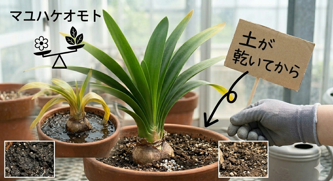 ですが、マユハケオモトはお水のあげすぎがとても苦手なんです。特に球根植物は、土の中の球根にお水を溜め込んでいるので、いつも土が湿っていると根っこや球根が傷んでしまうことがあります。