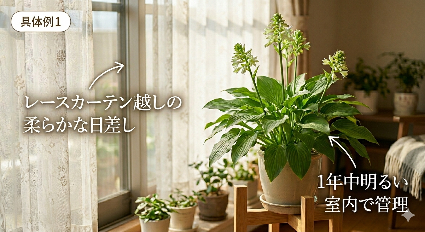 具体例1:1年中柔らかな日差しを当てる置き場所の工夫