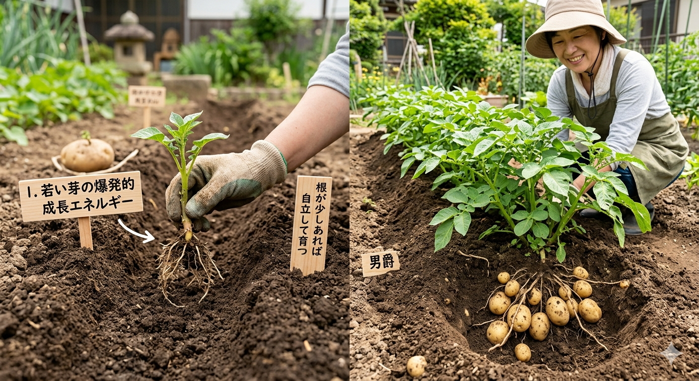 ・この方法は「ジャガ芽挿し農法」とも呼ばれ、種芋のコストを抑えて収穫量を増やすことができるとされています。