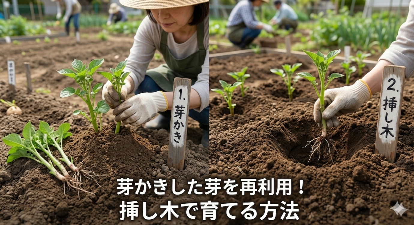 実は、この芽かきした芽を植え付ける方法は、単なる家庭菜園の裏技にとどまりません。農業の世界でも「ジャガ芽挿し農法」として注目されている手法の一つなんですね。