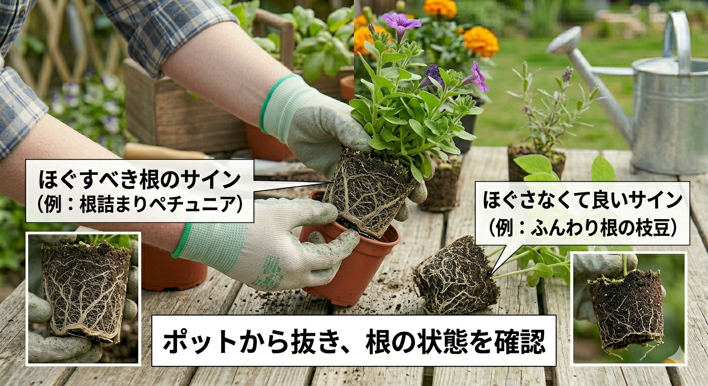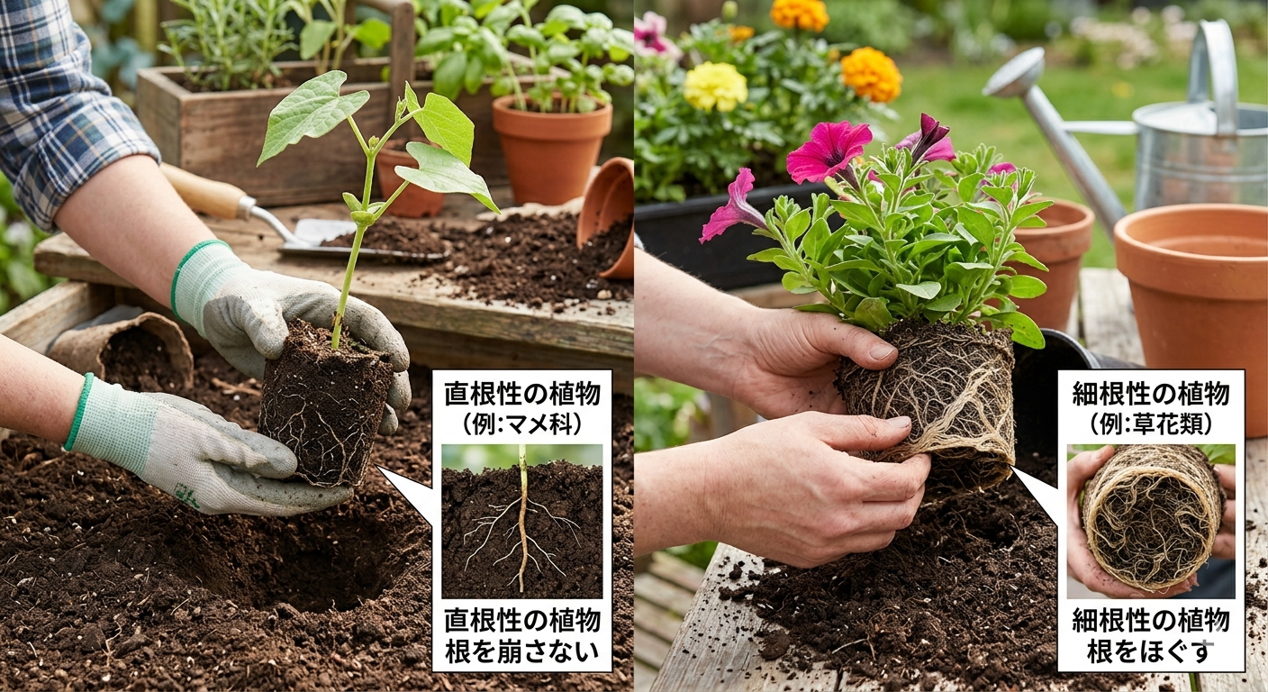 - 植物の性質を知る:マメ科や根菜類など「移植を嫌う植物」は、どんな状態でも絶対に根鉢を崩してはいけません。