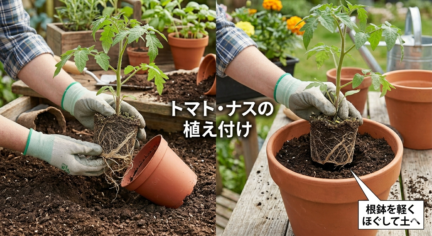 | 丈夫な野菜苗 | トマト、ナス、ピーマンなど | 根がカチカチに回っている場合のみ、底を軽くほぐして植え付けます。 |