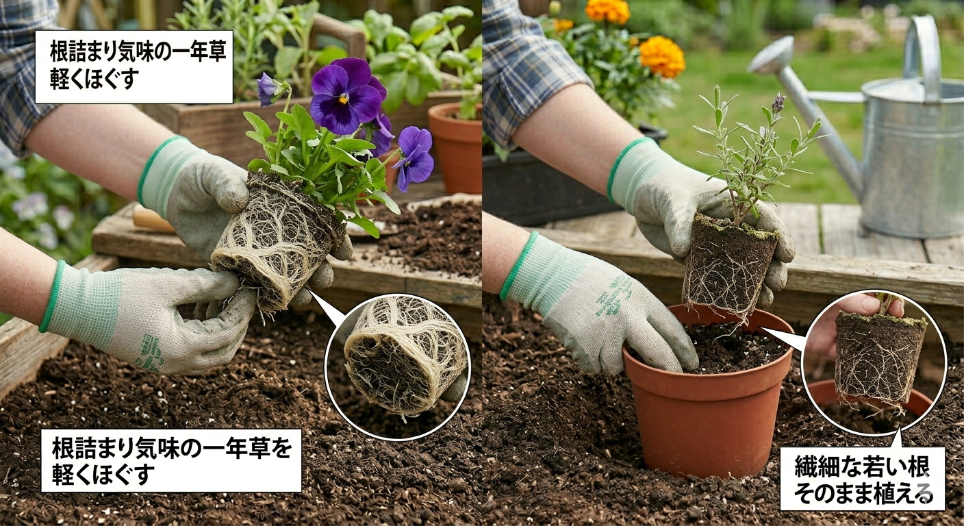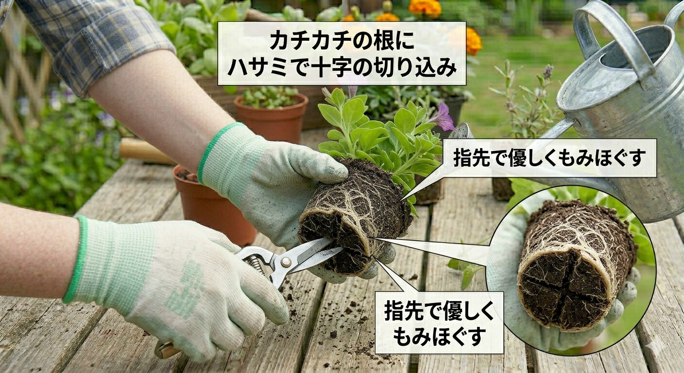 間違った方法で力任せにやってしまうと、植物を傷つけてしまうかもしれません。ここでは、植物に負担をかけない「優しくて正しい根のほぐし方」を、ステップごとに分かりやすく解説していきますね。