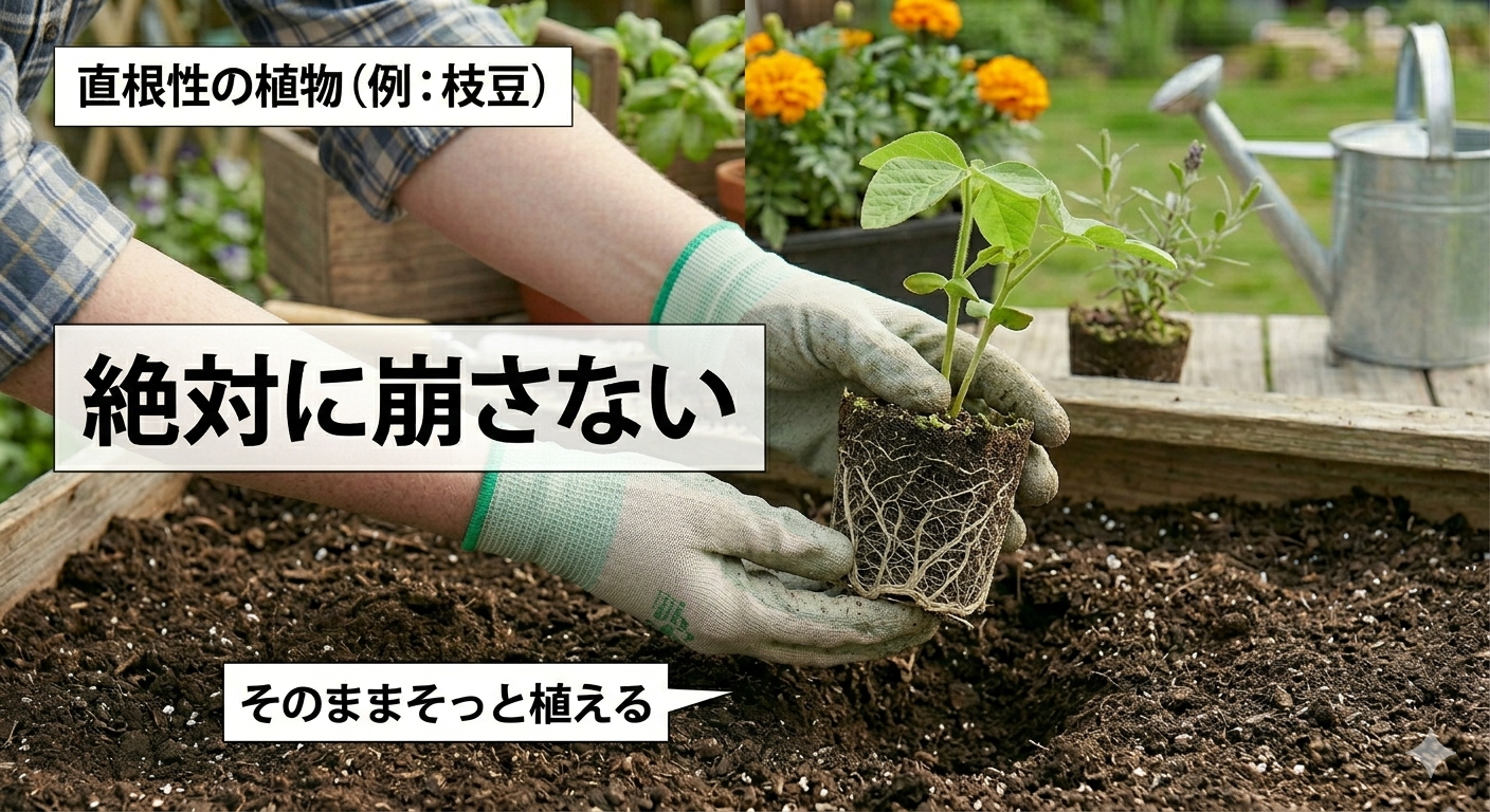 | 移植を嫌う植物 | 枝豆、オクラ、大根、トウモロコシ | 絶対にほぐさない。根鉢を崩さず、そのままそっと優しく植え付けます。 |