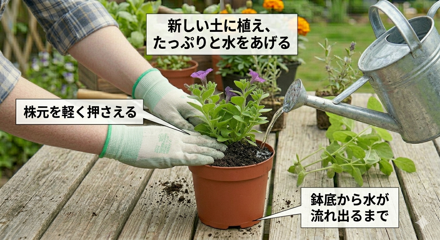 ステップ3:新しい土に植え、たっぷりと水をあげる