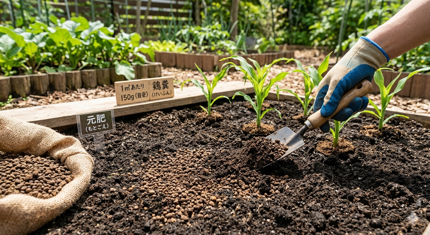 ここからは、実際に家庭菜園で鶏糞を使う時の「具体的な量」や「まき方のコツ」についてご紹介しますね。適量を知ることで、失敗なく元気なトウモロコシを育てることができますよ。