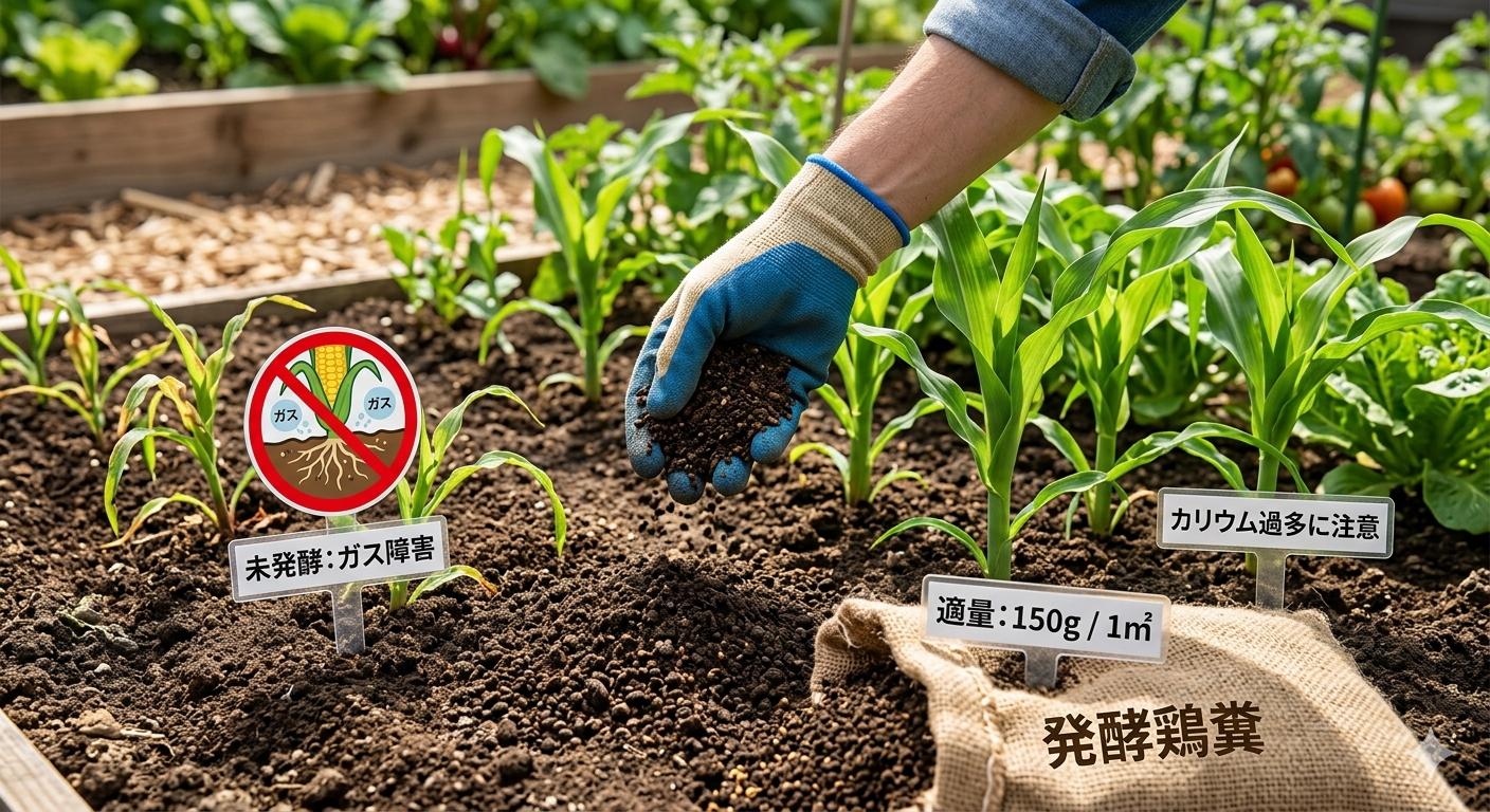 ここまで鶏糞の素晴らしいところをたくさんご紹介してきましたが、自然の恵みだからこそ、使う時に気をつけておきたいポイントもいくつかあります。安全に、そして確実に美味しいトウモロコシを収穫するために、ぜひ知っておいてくださいね。