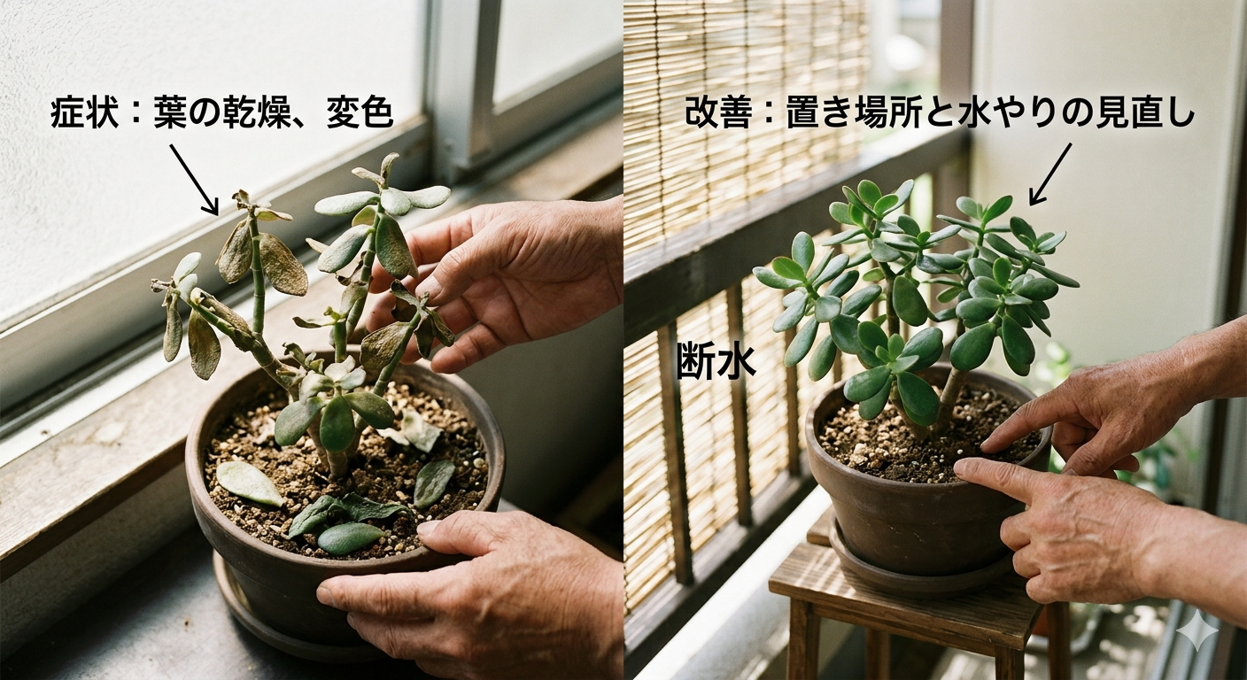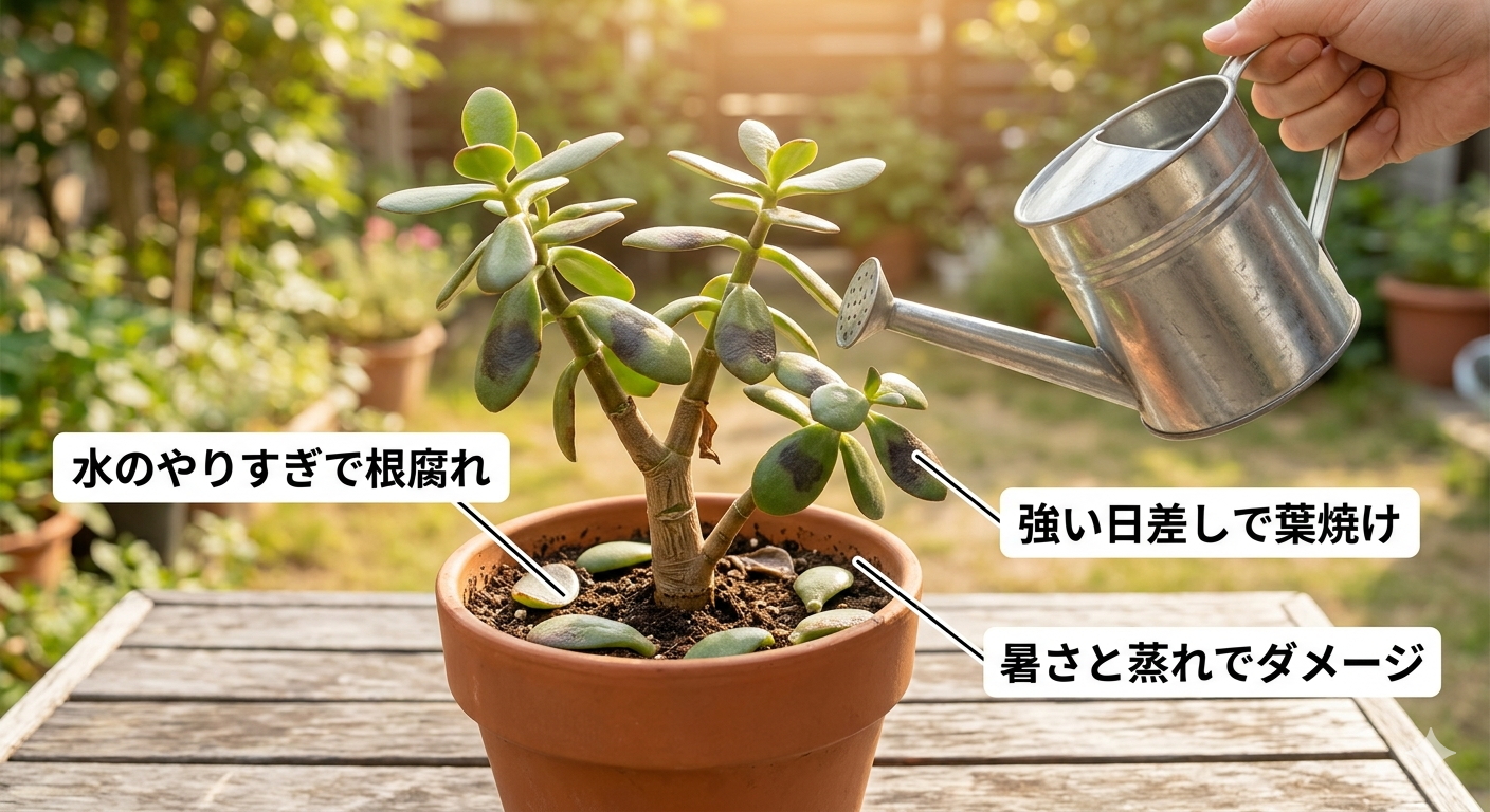 ベランダや室内で気軽に楽しめる多肉植物の中でも、金のなる木は人気の高い存在です。ところが夏の猛暑が続くと、葉がポロポロ落ちたり、茎がやわらかくなったりして不安になりますよね。