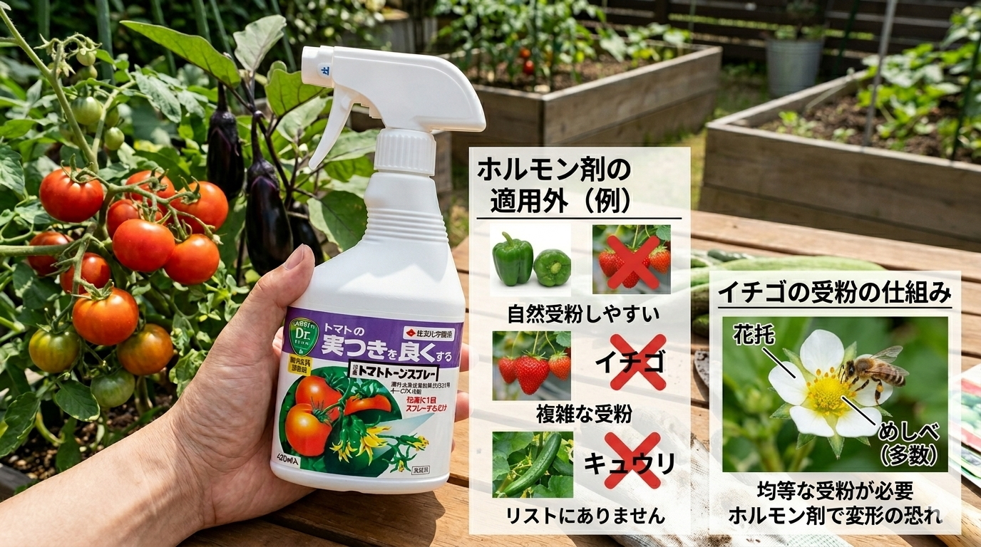 イチゴについても同様に適用作物として記載されていませんので、基本的には使用を控えるか、ご使用前に製品の説明書をよく確認し、販売業者さんに相談することをおすすめします。「じゃあ、ピーマンやイチゴはどうやって実をつけさせればいいの?」という疑問については、後ほどたっぷりと解決策をご紹介しますので安心してくださいね!