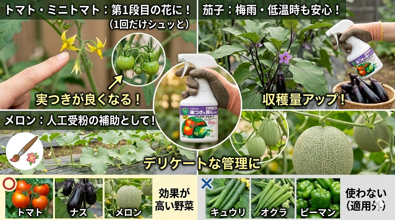 | 果菜類(ナス科) | トマト、ミニトマト、ナス | 使用可能(特に初期の着果に効果大) |